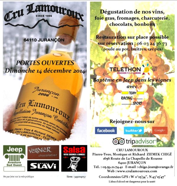 El Cru Lamouroux abrirá sus puertas el 14 de diciembre, 2014 En esta ocasión, les proponemos catar todos nuestros vinos, así como la venta de queso del Valle de Ossau, embutidos bearnesos, ostras de Bretaña y crepes. Los artesanos confiteros y chocolateros Verdier estarán presentes para hacerles descubrir caramelos, dulces, bombones y otras golosinas. Descubrirán…